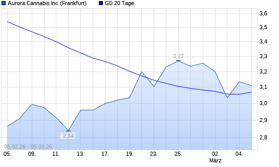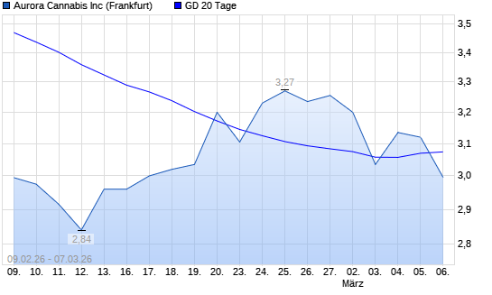 Mit dem Anstieg auf 3,14 EUR hat die Aurora Cannabis-Aktie am 04.03.2026 die 20-Tage-Linie nach oben gekreuzt.Die Aurora Cannabis-Aktie befindet sich seit dem 22.12.2025 im ...weiterlesen