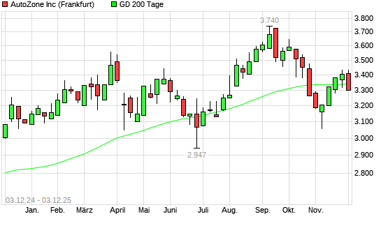 Mit dem Rücksetzer auf 3.298,00 EUR hat die AutoZone-Aktie am 02.12.2025 die 200-Tage-Linie nach unten gekreuzt.Die AutoZone-Aktie befand sich seit dem 20.11.2025 im langfristigen Aufwärtstrend ...weiterlesen