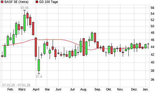 Mit dem Anstieg auf 44,56 EUR hat die BASF-Aktie am 06.01.2026 die 100-Tage-Linie nach oben gekreuzt.Die BASF-Aktie befindet sich seit dem 26.12.2025 im langfristigen Aufwärtstrend und hat in ...weiterlesen