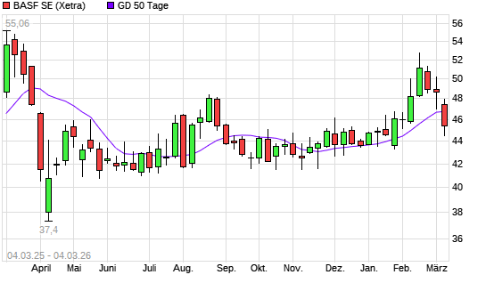 Mit dem Rücksetzer auf 45,75 EUR hat die BASF-Aktie am 03.03.2026 die 50-Tage-Linie nach unten gekreuzt.Die BASF-Aktie befindet sich seit dem 21.01.2026 im langfristigen ...weiterlesen