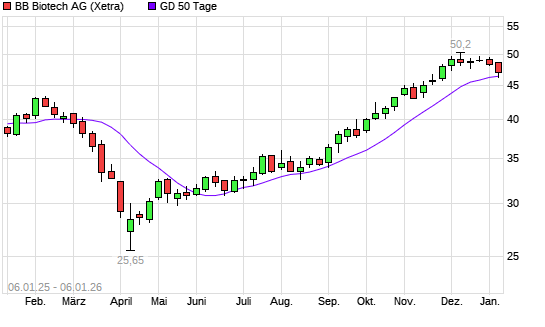 Mit dem Anstieg auf 53,30 EUR hat die BB Biotech-Aktie (ISIN CH0038389992) am 15.01.2026 ein neues 12-Monats-Hoch erreicht und damit den Kurs vom 14.01.2026 eingestellt.Die BB Biotech-Aktie ...weiterlesen