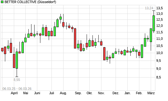 Mit dem Anstieg auf 13,00 EUR hat die BETTER COLLECTIVE-Aktie (ISIN DK0060952240) am 05.03.2026 ein neues 6-Monats-Hoch erreicht und damit den Kurs vom 04.03.2026 eingestellt.Die ...weiterlesen