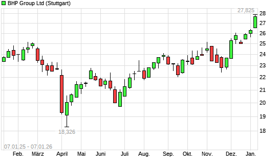 Mit dem Anstieg auf 27,67 EUR hat die BHP Group-Aktie (ISIN AU000000BHP4) am 06.01.2026 ein neues 12-Monats-Hoch erreicht und damit den Kurs vom 05.01.2026 eingestellt.Die BHP Group-Aktie befindet ...weiterlesen