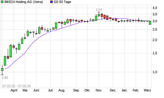 Mit dem Rücksetzer auf 2,96 EUR hat die BIKE24 Holding AG-Aktie am 06.03.2026 die 50-Tage-Linie nach unten gekreuzt.Die BIKE24 Holding AG-Aktie befindet sich seit dem 10.03.2025 ...weiterlesen