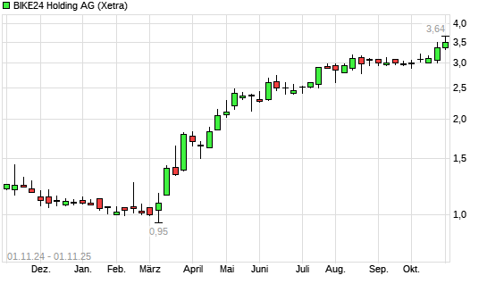 Mit dem Anstieg auf 3,53 EUR hat die BIKE24 Holding AG-Aktie (ISIN DE000A3CQ7F4) am 31.10.2025 ein neues 12-Monats-Hoch erreicht und damit den Kurs vom 22.10.2025 eingestellt.Die BIKE24 Holding ...weiterlesen