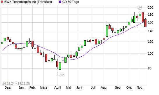 Mit dem Rücksetzer auf 151,00 EUR hat die BWX Technologies-Aktie am 13.11.2025 die 50-Tage-Linie nach unten gekreuzt.Die BWX Technologies-Aktie befindet sich seit dem 26.05.2025 im langfristigen ...weiterlesen