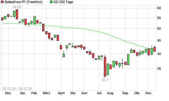 Mit dem Rücksetzer auf 40,84 EUR hat die Bakkafrost-Aktie am 14.11.2025 die 200-Tage-Linie nach unten gekreuzt.Die Bakkafrost-Aktie befand sich seit dem 07.11.2025 im langfristigen Aufwärtstrend ...weiterlesen