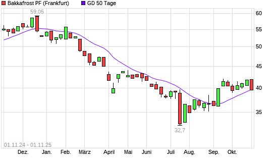 Mit dem Rücksetzer auf 39,46 EUR hat die Bakkafrost-Aktie am 31.10.2025 die 50-Tage-Linie nach unten gekreuzt.Die Bakkafrost-Aktie befindet sich seit dem 18.02.2025 im langfristigen Abwärtstrend ...weiterlesen