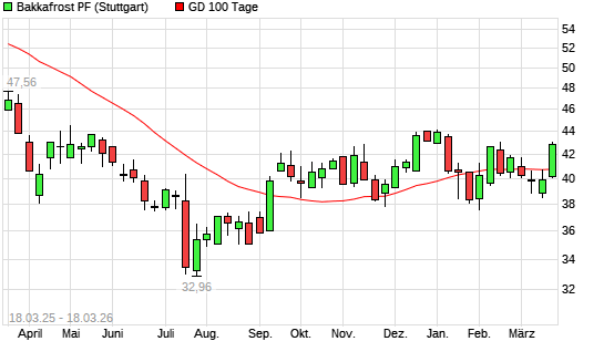 Mit dem Anstieg auf 42,18 EUR hat die Bakkafrost-Aktie am 17.03.2026 die 100-Tage-Linie nach oben gekreuzt.Die Bakkafrost-Aktie befindet sich seit dem 12.03.2026 im ...weiterlesen