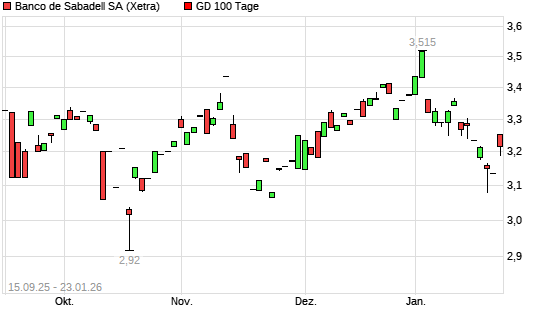 Mit dem Rücksetzer auf 3,25 EUR hat die Banco Sabadell-Aktie am 22.01.2026 die 100-Tage-Linie nach unten gekreuzt.Die Banco Sabadell-Aktie befindet sich seit dem 27.10.2023 im langfristigen ...weiterlesen