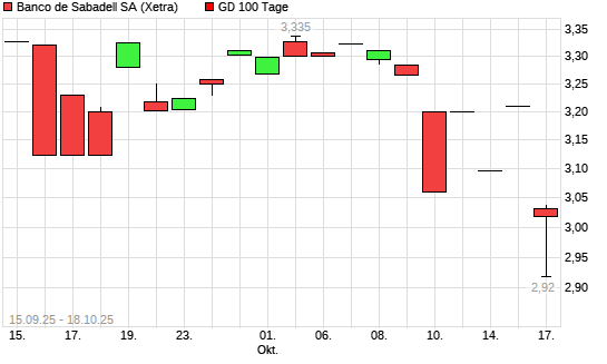 Mit dem Rücksetzer auf 3,01 EUR hat die Banco Sabadell-Aktie am 17.10.2025 die 100-Tage-Linie nach unten gekreuzt.Die Banco Sabadell-Aktie befindet sich seit dem 27.10.2023 im langfristigen ...weiterlesen