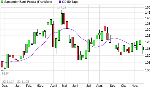 Mit dem Anstieg auf 116,30 EUR hat die Bank Zachodni-Aktie am 21.11.2025 die 50-Tage-Linie nach oben gekreuzt.Die Bank Zachodni-Aktie befindet sich seit dem 29.08.2025 im langfristigen Abwärtstrend ...weiterlesen