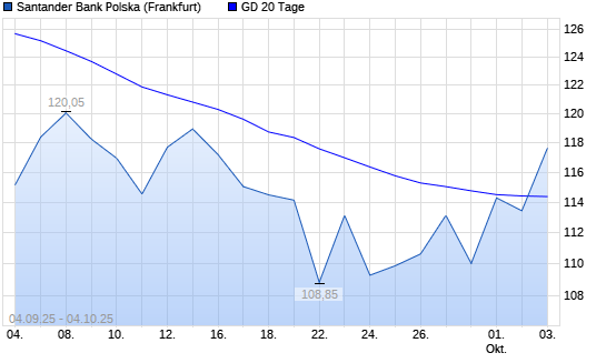 Mit dem Anstieg auf 117,60 EUR hat die Bank Zachodni-Aktie am 03.10.2025 die 20-Tage-Linie nach oben gekreuzt.Die Bank Zachodni-Aktie befindet sich seit dem 29.08.2025 im langfristigen Abwärtstrend ...weiterlesen