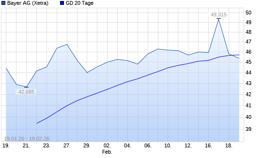 Mit dem Rücksetzer auf 45,30 EUR hat die Bayer-Aktie am 18.02.2026 die 20-Tage-Linie nach unten gekreuzt.Die Bayer-Aktie befindet sich seit dem 20.05.2025 im ...weiterlesen