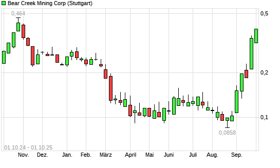 Mit dem Anstieg auf 0,43 EUR hat die Bear Creek Mining-Aktie (ISIN CA07380N1042) am 30.09.2025 ein neues 6-Monats-Hoch erreicht und damit den Kurs vom 29.09.2025 eingestellt.Die Bear Creek Mining-Aktie ...weiterlesen