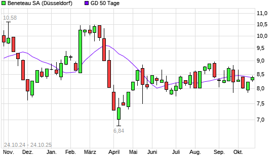 Mit dem Rücksetzer auf 8,31 EUR hat die Beneteau-Aktie am 23.10.2025 die 50-Tage-Linie nach unten gekreuzt.Die Beneteau-Aktie befindet sich seit dem 03.10.2025 im langfristigen Abwärtstrend ...weiterlesen