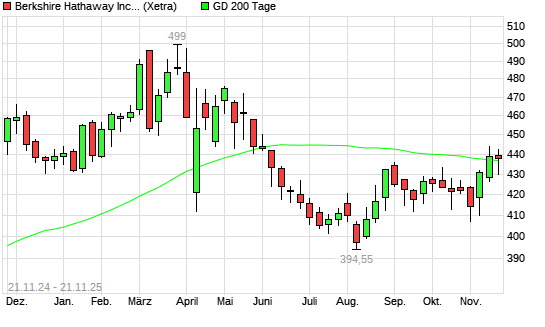 Mit dem Anstieg auf 439,60 EUR hat die Berkshire Hathaway B-Aktie am 20.11.2025 die 200-Tage-Linie nach oben gekreuzt.Die Berkshire Hathaway B-Aktie befand sich seit dem 17.11.2025 im langfristigen ...weiterlesen