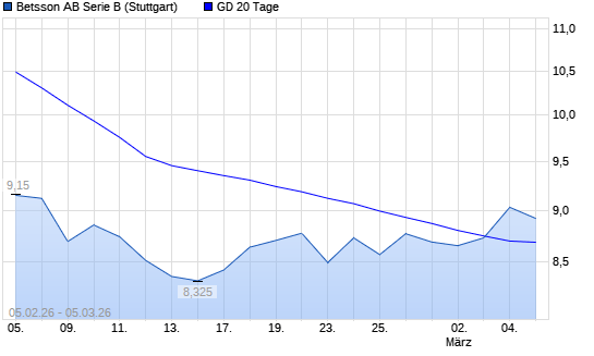 Mit dem Anstieg auf 8,85 EUR hat die Betsson-Aktie am 04.03.2026 die 20-Tage-Linie nach oben gekreuzt.Die Betsson-Aktie befindet sich seit dem 29.08.2025 im langfristigen Abwärtstrend ...weiterlesen