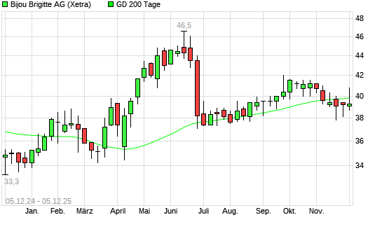 Mit dem Anstieg auf 40,80 EUR hat die Bijou Brigitte-Aktie am 04.12.2025 die 200-Tage-Linie nach oben gekreuzt.Die Bijou Brigitte-Aktie befand sich seit dem 20.11.2025 im langfristigen Abwärtstrend ...weiterlesen