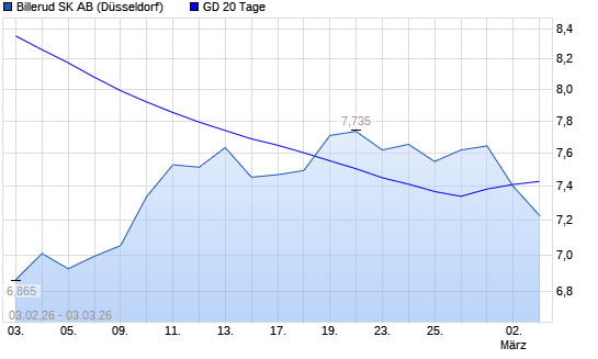 Mit dem Rücksetzer auf 7,26 EUR hat die Billerud SK AB-Aktie am 02.03.2026 die 20-Tage-Linie nach unten gekreuzt.Die Billerud SK AB-Aktie befindet sich seit dem 29.01.2026 ...weiterlesen