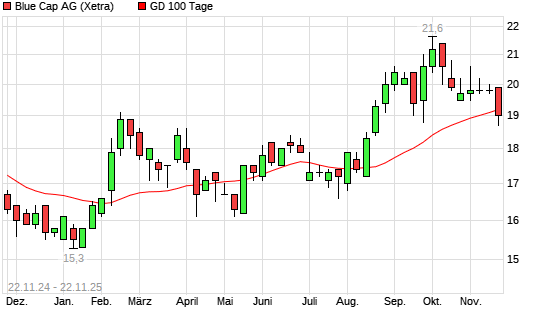 Mit dem Rücksetzer auf 18,90 EUR hat die Blue Cap-Aktie am 21.11.2025 die 100-Tage-Linie nach unten gekreuzt.Die Blue Cap-Aktie befindet sich seit dem 30.07.2025 im langfristigen Aufwärtstrend ...weiterlesen