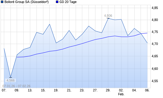 Mit dem Rücksetzer auf 4,74 EUR hat die Bollore-Aktie am 06.02.2026 die 20-Tage-Linie nach unten gekreuzt.Die Bollore-Aktie befindet sich seit dem 27.05.2025 im langfristigen Abwärtstrend ...weiterlesen