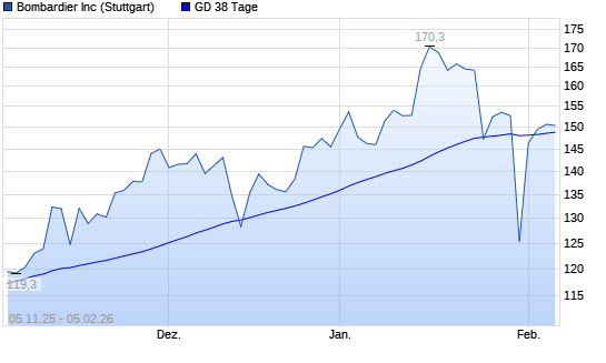 Mit dem Rücksetzer auf 149,20 EUR hat die Bombardier-Aktie am 04.02.2026 die 38-Tage-Linie nach unten gekreuzt.Die Bombardier-Aktie befindet sich seit dem 04.06.2025 im langfristigen Aufwärtstrend ...weiterlesen