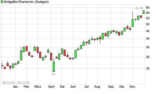 Mit dem Anstieg auf 61,22 EUR hat die BridgeBio Pharma-Aktie (ISIN US10806X1028) am 25.11.2025 ein neues All-Time-High erreicht und damit den Kurs vom 02.03.2021 eingestellt.Die BridgeBio Pharma-Aktie ...weiterlesen
