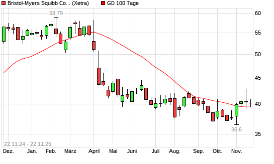 Mit dem Rücksetzer auf 39,55 EUR hat die Bristol-Myers-Aktie am 21.11.2025 die 100-Tage-Linie nach unten gekreuzt.Die Bristol-Myers-Aktie befindet sich seit dem 07.04.2025 im langfristigen ...weiterlesen