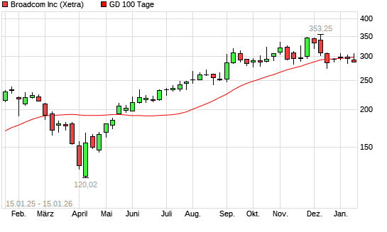 Mit dem Rücksetzer auf 288,00 EUR hat die Broadcom-Aktie am 14.01.2026 die 100-Tage-Linie nach unten gekreuzt.Die Broadcom-Aktie befindet sich seit dem 02.05.2025 im langfristigen Aufwärtstrend ...weiterlesen