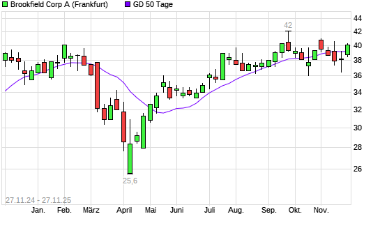 Mit dem Anstieg auf 40,30 EUR hat die Brookfield Asset Management-Aktie am 26.11.2025 die 50-Tage-Linie nach oben gekreuzt.Die Brookfield Asset Management-Aktie befindet sich seit dem 02.07.2025 ...weiterlesen