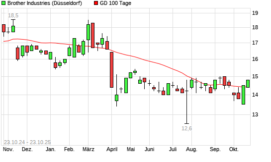Mit dem Anstieg auf 14,80 EUR hat die Brother Industries-Aktie am 22.10.2025 die 100-Tage-Linie nach oben gekreuzt.Die Brother Industries-Aktie befindet sich seit dem 28.03.2025 im langfristigen ...weiterlesen