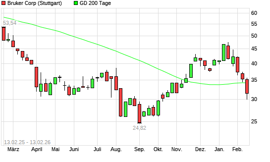 Mit dem Rücksetzer auf 30,50 EUR hat die Bruker-Aktie am 12.02.2026 die 200-Tage-Linie nach unten gekreuzt.Die Bruker-Aktie befand sich seit dem 09.02.2026 im langfristigen Aufwärtstrend ...weiterlesen