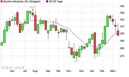 Mit dem Anstieg auf 400,00 EUR hat die Bucher Industries-Aktie am 12.03.2026 die 50-Tage-Linie nach oben gekreuzt.Die Bucher Industries-Aktie befindet sich seit dem 10.03.2026 ...weiterlesen