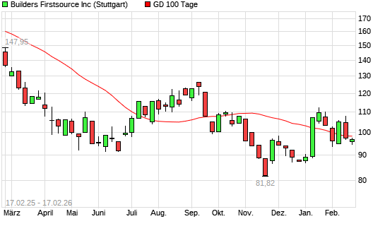 Mit dem Rücksetzer auf 96,36 EUR hat die Builders Firstsource-Aktie am 16.02.2026 die 100-Tage-Linie nach unten gekreuzt.Die Builders Firstsource-Aktie befindet sich seit ...weiterlesen