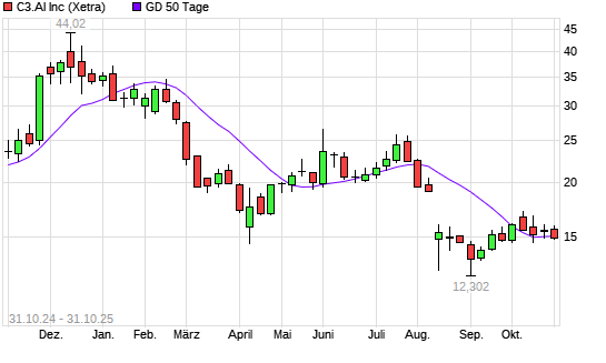 Mit dem Rücksetzer auf 14,95 EUR hat die C3.ai-Aktie am 30.10.2025 die 50-Tage-Linie nach unten gekreuzt.Die C3.ai-Aktie befindet sich seit dem 24.02.2025 im langfristigen Abwärtstrend ...weiterlesen