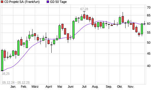 Mit dem Anstieg auf 59,62 EUR hat die CD Projekt-Aktie am 04.12.2025 die 50-Tage-Linie nach oben gekreuzt.Die CD Projekt-Aktie befindet sich seit dem 26.11.2025 im langfristigen Aufwärtstrend ...weiterlesen