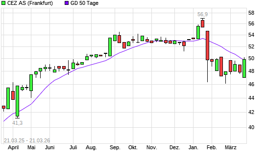 Mit dem Anstieg auf 49,90 EUR hat die CEZ-Aktie am 20.03.2026 die 50-Tage-Linie nach oben gekreuzt.Die CEZ-Aktie befindet sich seit dem 20.01.2026 im langfristigen Abwärtstrend und hat ...weiterlesen