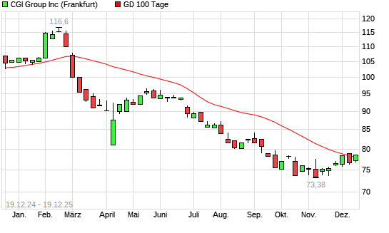 Mit dem Anstieg auf 78,38 EUR hat die CGI Group-Aktie am 18.12.2025 die 100-Tage-Linie nach oben gekreuzt.Die CGI Group-Aktie befindet sich seit dem 28.02.2025 im langfristigen Abwärtstrend ...weiterlesen