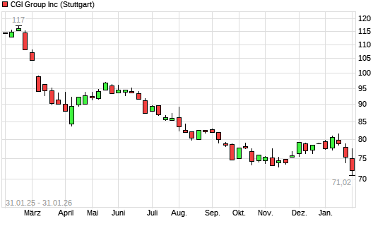Mit dem Rücksetzer auf 71,22 EUR hat die CGI Group-Aktie (ISIN CA12532H1047) am 30.01.2026 ein neues 3-Jahres-Tief erreicht und damit den Kurs vom 29.01.2026 eingestellt.Die CGI Group-Aktie ...weiterlesen