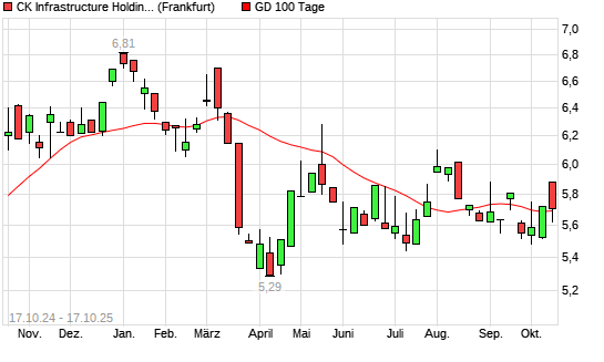 Mit dem Anstieg auf 5,70 EUR hat die CK Infrastructure Holdings-Aktie am 16.10.2025 die 100-Tage-Linie nach oben gekreuzt.Die CK Infrastructure Holdings-Aktie befindet sich seit dem 14.10.2025 ...weiterlesen