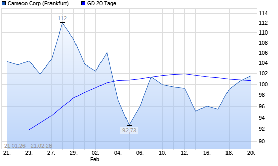 Mit dem Anstieg auf 101,62 EUR hat die Cameco-Aktie am 20.02.2026 die 20-Tage-Linie nach oben gekreuzt.Die Cameco-Aktie befindet sich seit dem 09.05.2025 im langfristigen Aufwärtstrend ...weiterlesen