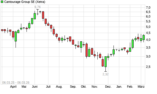 Mit dem Anstieg auf 4,23 EUR hat die Cantourage Group-Aktie (ISIN DE000A3DSV01) am 05.03.2026 ein neues 6-Monats-Hoch erreicht und damit den Kurs vom 16.02.2026 eingestellt.Die ...weiterlesen