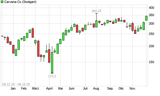 Mit dem Anstieg auf 344,30 EUR hat die Carvana Co.-Aktie (ISIN US1468691027) am 05.12.2025 ein neues All-Time-High erreicht und damit den Kurs vom 03.12.2025 eingestellt.Die Carvana Co.-Aktie ...weiterlesen