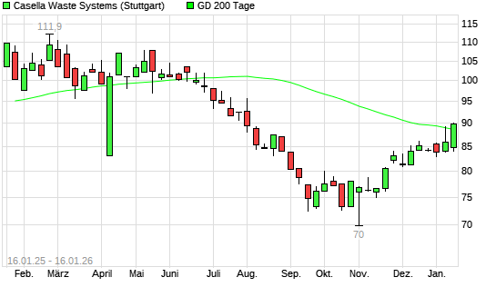 Mit dem Anstieg auf 89,88 EUR hat die Casella Waste Systems-Aktie am 15.01.2026 die 200-Tage-Linie nach oben gekreuzt.Die Casella Waste Systems-Aktie befand sich seit dem 25.06.2025 im langfristigen ...weiterlesen