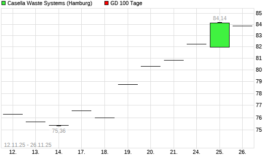 Mit dem Anstieg auf 83,68 EUR hat die Casella Waste Systems-Aktie am 25.11.2025 die 100-Tage-Linie nach oben gekreuzt.Die Casella Waste Systems-Aktie befindet sich seit dem 25.06.2025 im langfristigen ...weiterlesen