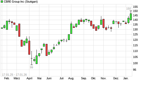 Mit dem Anstieg auf 146,00 EUR hat die Cbre Group-Aktie (ISIN US12504L1098) am 16.01.2026 ein neues All-Time-High erreicht und damit den Kurs vom 06.02.2025 eingestellt.Die Cbre Group-Aktie ...weiterlesen