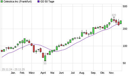 Mit dem Anstieg auf 264,00 EUR hat die Celestica-Aktie am 24.11.2025 die 50-Tage-Linie nach oben gekreuzt.Die Celestica-Aktie befindet sich seit dem 02.05.2025 im langfristigen Aufwärtstrend ...weiterlesen