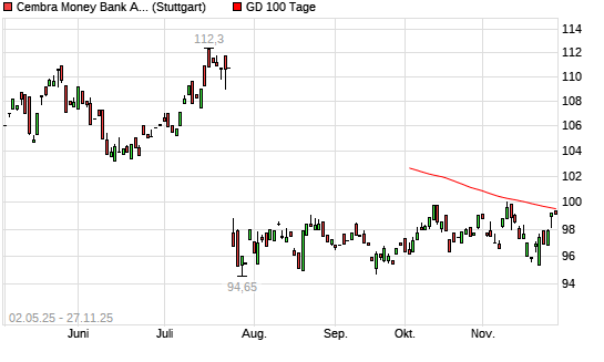Mit dem Anstieg auf 99,00 EUR hat die Cembra Money Bank AG-Aktie am 26.11.2025 die 100-Tage-Linie nach oben gekreuzt.Die Cembra Money Bank AG-Aktie befindet sich seit dem 01.08.2025 im langfristigen ...weiterlesen