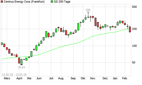 Mit dem Rücksetzer auf 179,10 EUR hat die Centrus Energy-Aktie am 11.02.2026 die 200-Tage-Linie nach unten gekreuzt.Die Centrus Energy-Aktie befand sich seit dem 07.05.2025 im langfristigen ...weiterlesen